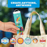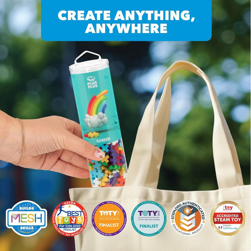 Plus-Plus viene en un mundo de colores, y nuestra mezcla de colores arcoíris no es la excepción. En el tubo encontrarás rojo, naranja, amarillo, blanco, verde manzana, turquesa, morado y blanco.
