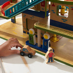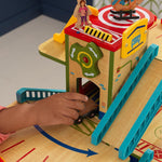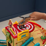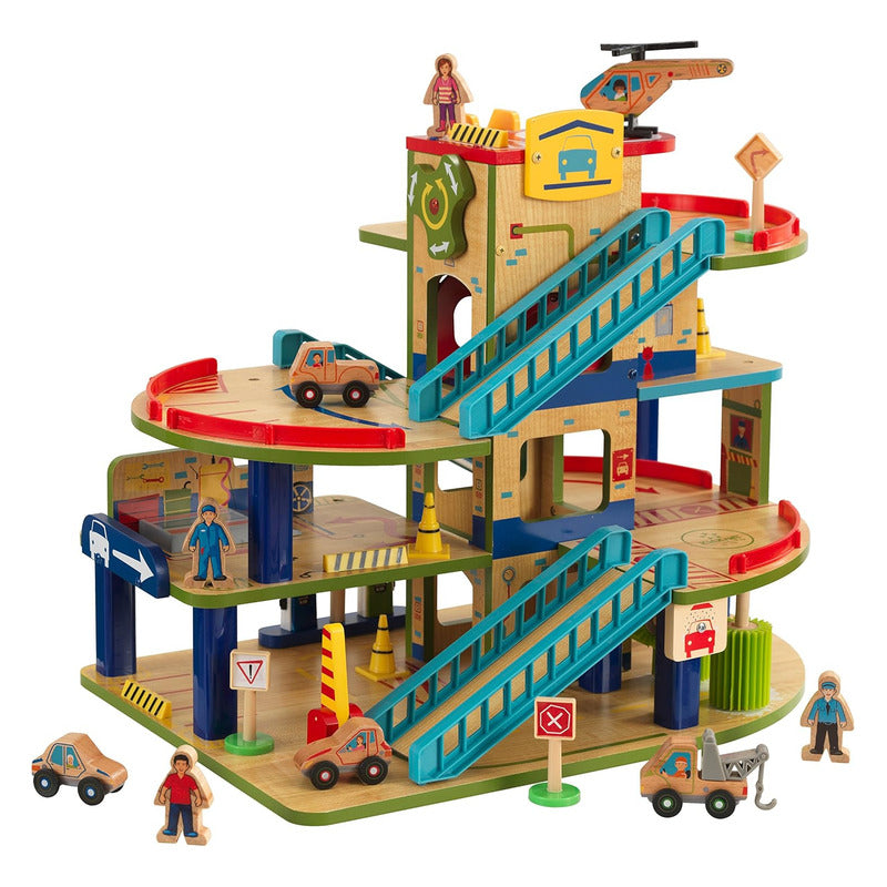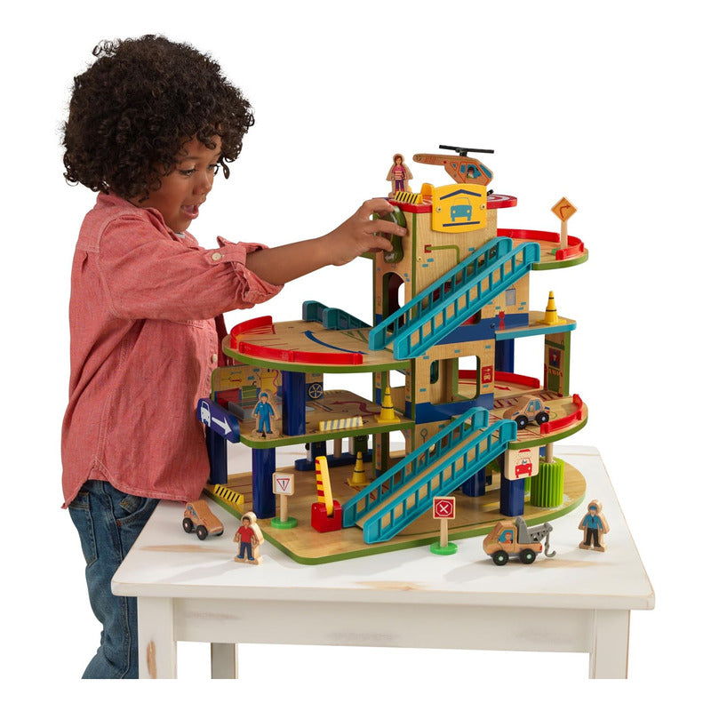 Los niños pueden subir en el ascensor los coches de madera incluidos hasta la planta superior, donde un helicóptero espera en el helipuerto. Baja las rampas pasando junto al taller mecánico y a sonrientes personas hasta llegar al autolavado con sus cepillos que giran. Reposa en la gasolinera y, a continuación, vuelve al ascensor para repetirlo todo.