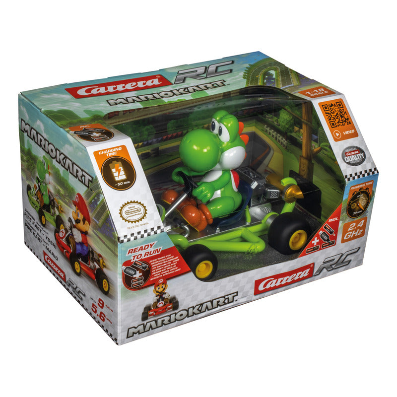 Famoso por los videojuegos de culto Mario Kart, Yoshi se embarca en aventuras de carreras de alta velocidad en el dormitorio y el salón en su Carrera RC Mario Kart Pipe Kart Kart. En cada vuelta, Yoshi alcanza velocidades máximas de 9 km/h, luchando por la victoria durante hasta 30 minutos gracias a la unidad de potencia LiFePo4 y las baterías, todas incluidas en la caja.