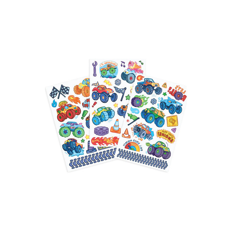 El set de tatuajes temporales de Monster Trucks incluye 3 láminas temporales; ¡son más de 50 tatuajes en un set! Este set de tatuajes está lleno de simpáticos camiones, autopartes y mucho más.