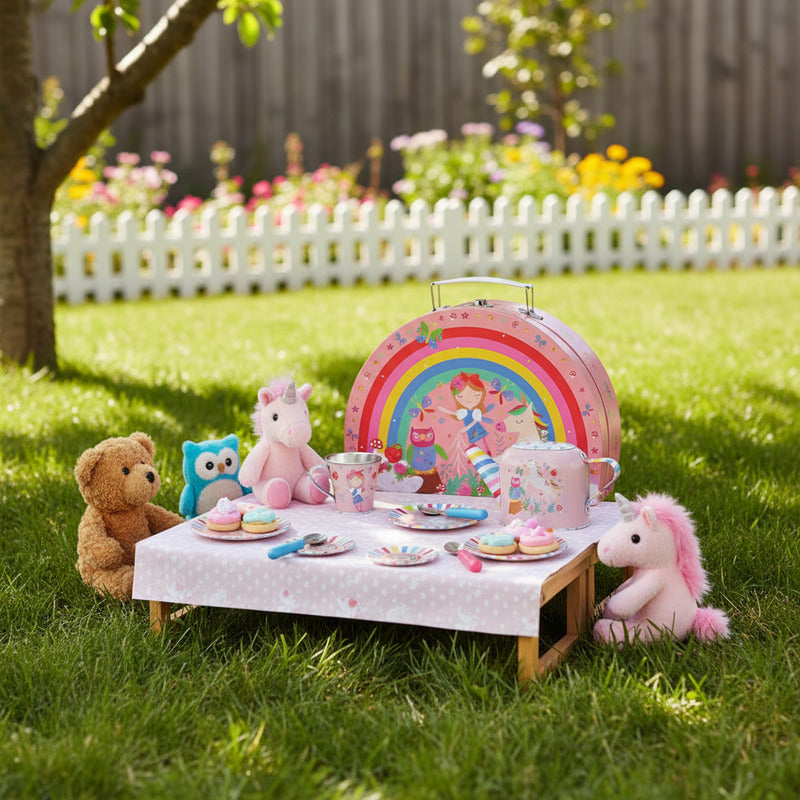 ¡Las niñas no se cansan de nuestros juegos de té de hojalata súper lindos! Organice una fiesta de té con las hadas y los divertidos animales del bosque suministrados en un estuche de transporte reutilizable con forma de arco iris.