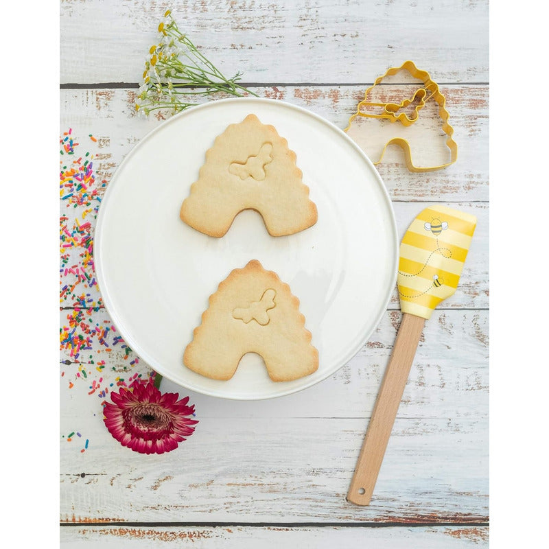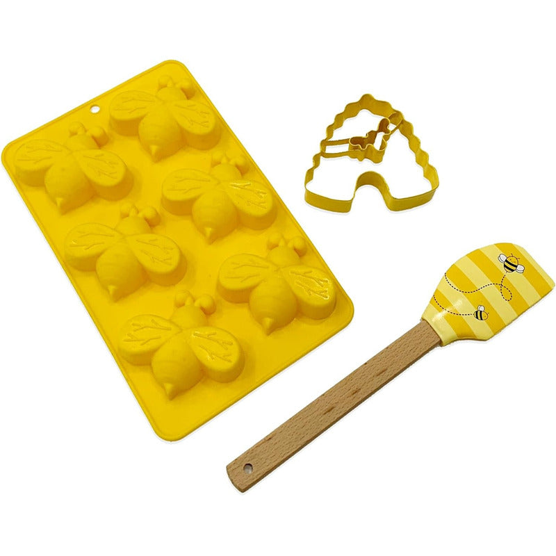INCLUYE: 1 molde de silicona para cupcakes con 6 formas de abeja, 1 espátula de silicona, 1 cortador de galletas de acero inoxidable y recetas.