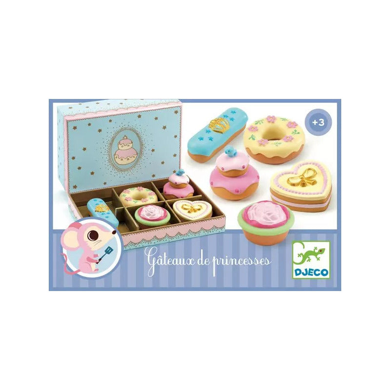 Descubre los pasteles de princesa de Djeco, una bonita caja ilustrada que contiene 5 pasteles de plástico blando para jugar en la cocina.