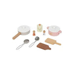 Su estilo se inspira en la cocina de la abuela, con todos los clásicos atemporales que aún nos encantan: 2 tablas de cortar, 1 sartén, 1 cacerola, 1 espumadera, 1 cucharón, 1 salero, 1 pimentero y 1 especiero.