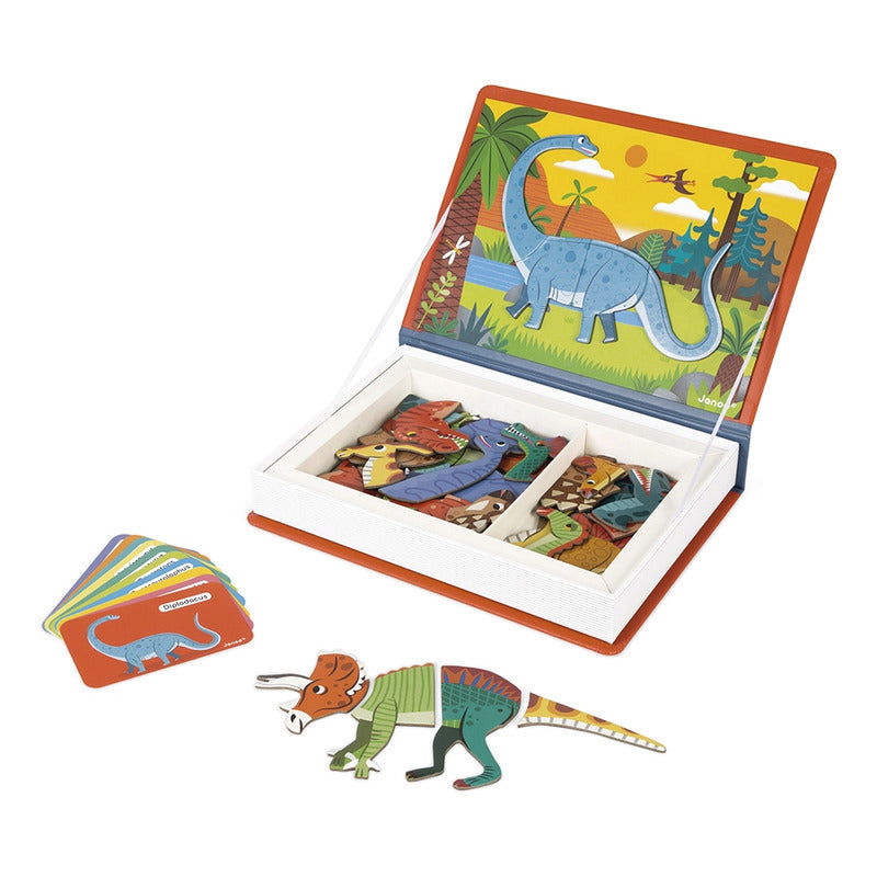 Este juego de cartón transportará a los niños a partir de 3 años al mundo de los dinosaurios gracias a sus 40 imanes y 10 cartas con el nombre del dinosaurio en latín. Una vez abierto el libro, el objetivo del juego es recomponer en la escena magnética el dinosaurio indicado en la tarjeta usando los imanes. El niño también puede divertirse mezclando las diferentes piezas entre sí para crear unas criaturas aún más aterradoras, ya que son todas intercambiables.