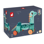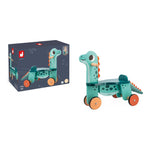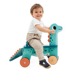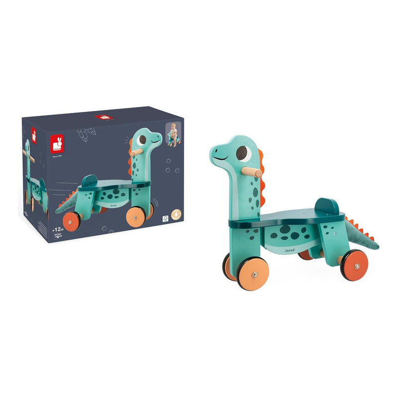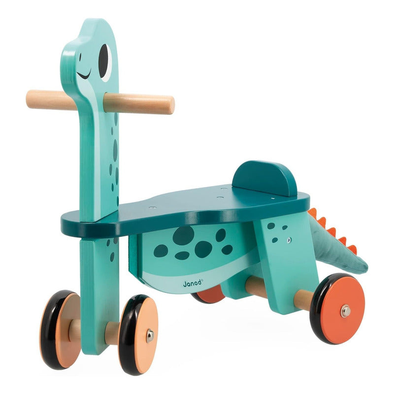 A partir de 12 meses el niño desarrollará su motricidad utilizando este andador de madera con 4 ruedas muy estables. Las dos ruedas delanteras se mueven con la cabeza del dinosaurio cuando el niño quiere girar. Las cuatro ruedas están revestidas de silicona para disfrutar de una conducción supersilenciosa.