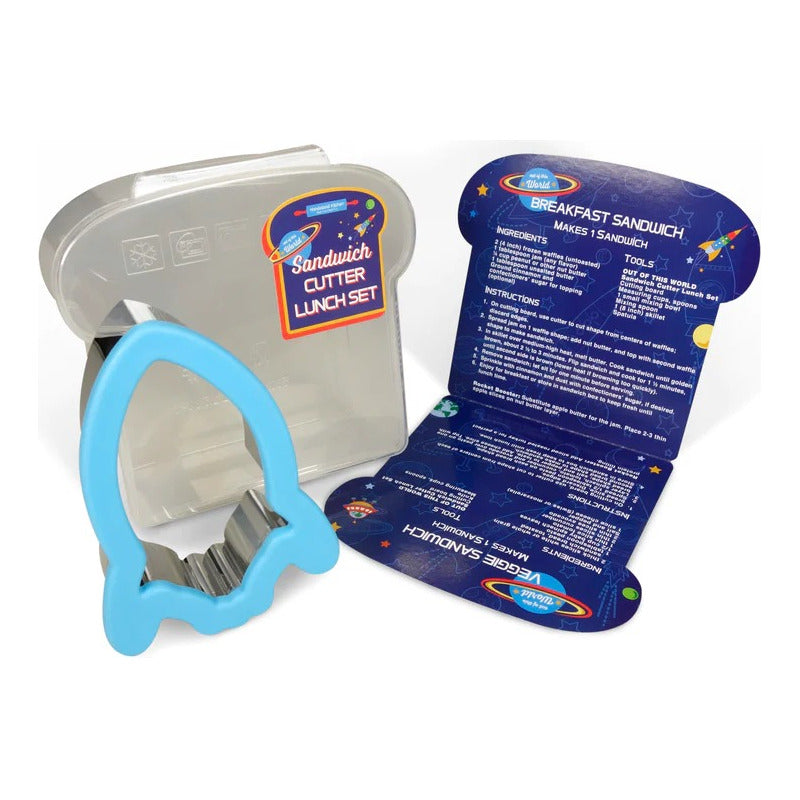 El set de 3 piezas incluye: 1 cortador de sándwiches de acero inoxidable en forma de cohete, 1 envase de sándwiches y recetas.
