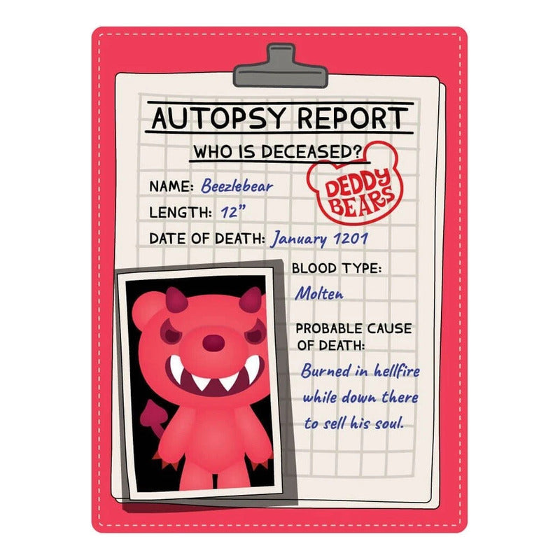 Desde el fogoso "Beezlebear" hasta el chiflado "Vambear", estos peluches sin duda cautivarán tu imaginación. Cada peluche Deddy Bear de 30cm viene empaquetado en una bolsa para cadáveres temática con cierre de cremallera para una emocionante experiencia de desempaquetado.