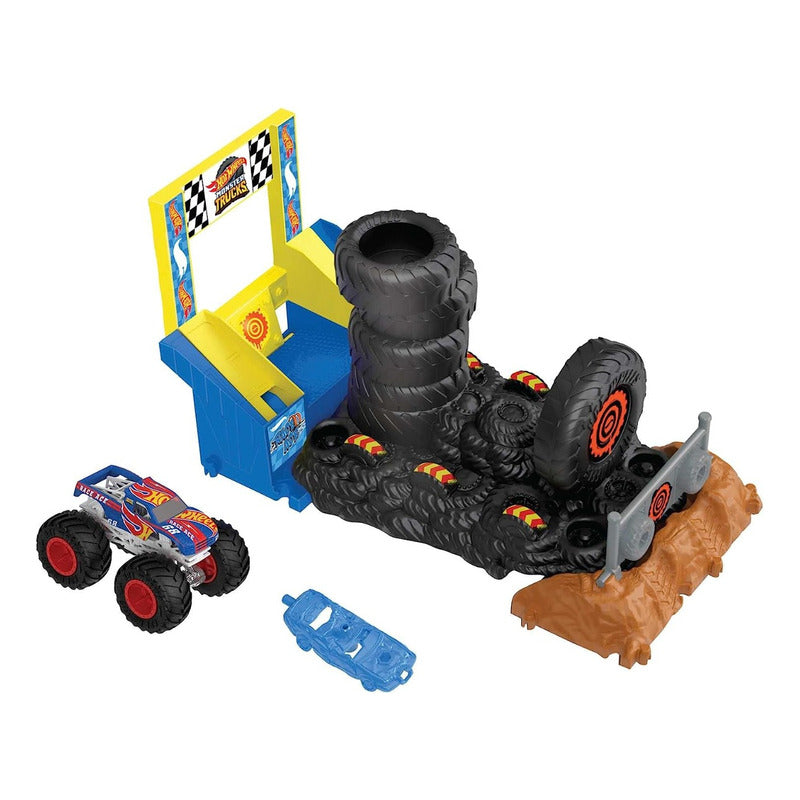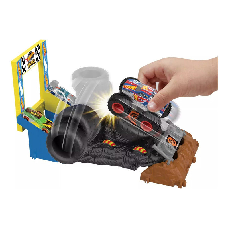 INCLUYE: 1 Set Neumáticos + 1 Monster Truck Hot Wheels (escala 1:64) + 1 Carrito Aplastado