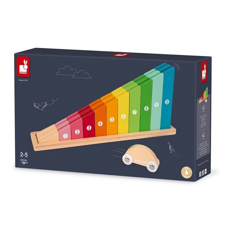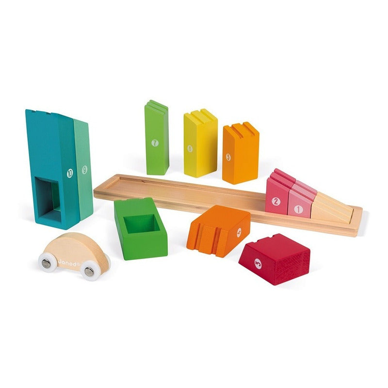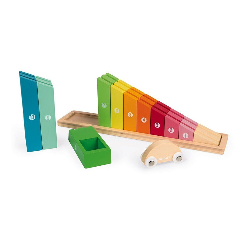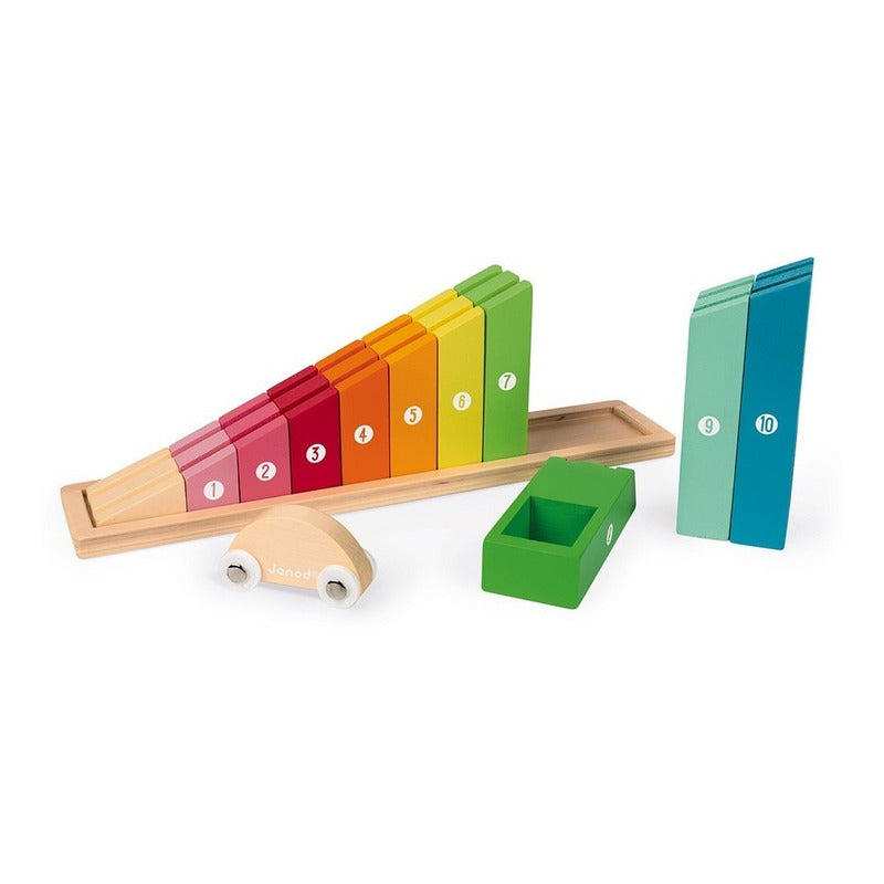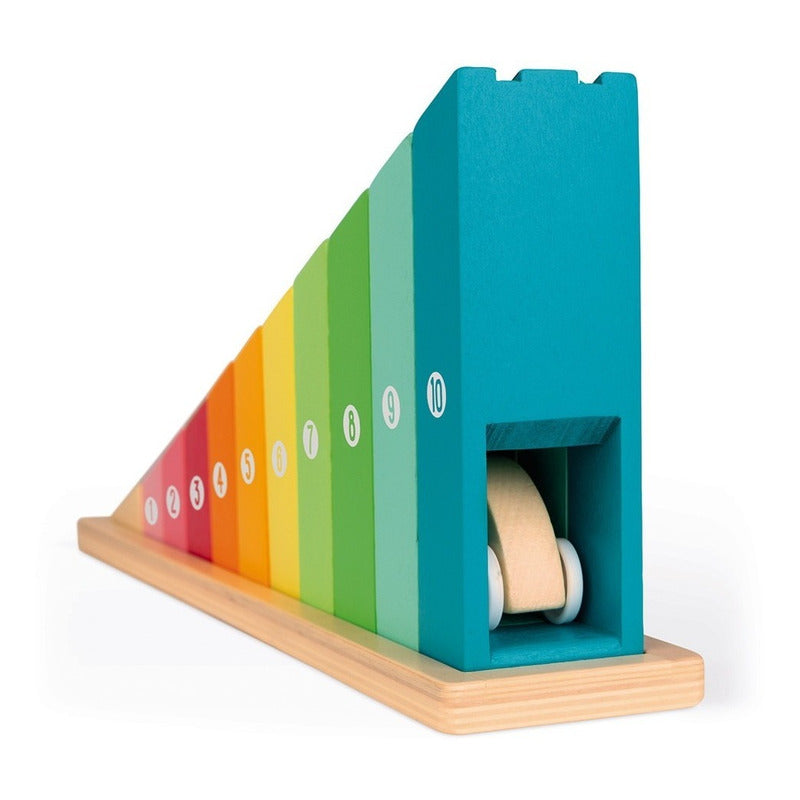 Este hermoso juego de construcción de madera está hecho de 10 bloques que se reemplazarán en orden ascendente en su base para formar una pendiente. Cada bloque está numerado del 1 al 10 para aprender el orden de magnitud. Una vez terminada la pendiente, el pequeño coche puede rodar hacia abajo para comprobar que no hay ningún error, ¡y luego aparcar en el garaje debajo de los últimos bloques! Este juego de construcción ayudará a su hijo a aprender números y tamaños. MEDIDAS: 33cm x 6,5cm x 13,8 cm aprox. ------------------------------------------------------------ ------------------------------------------------------------