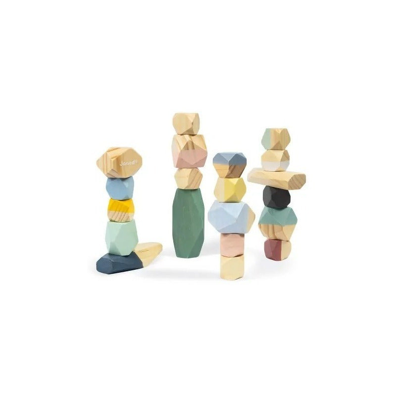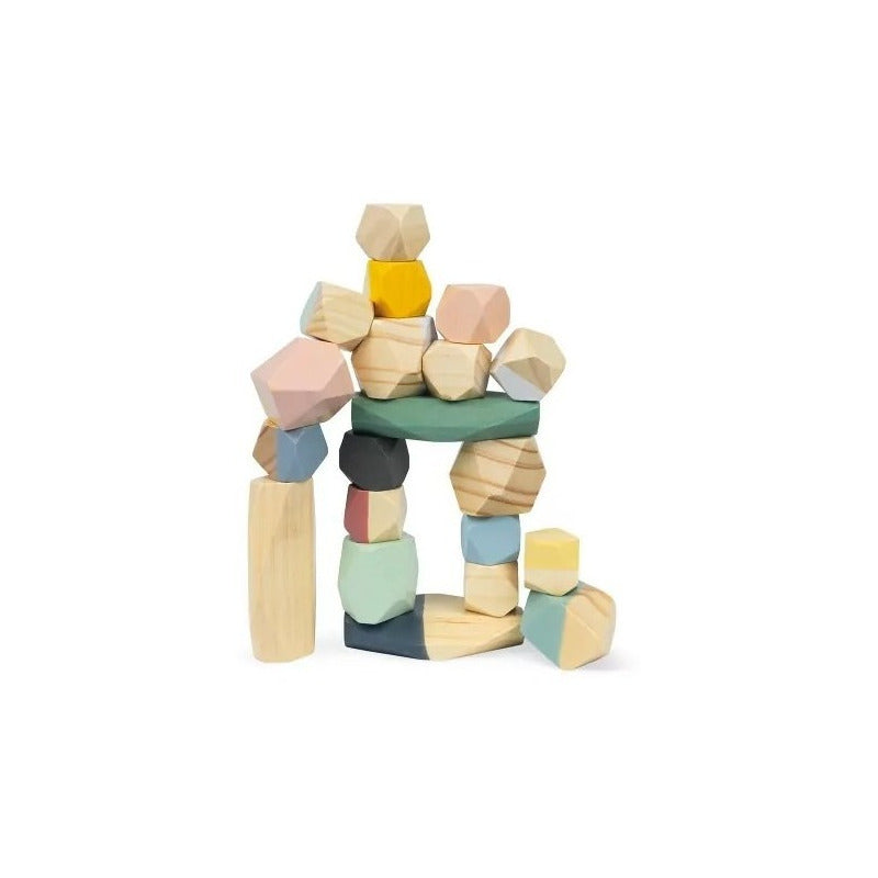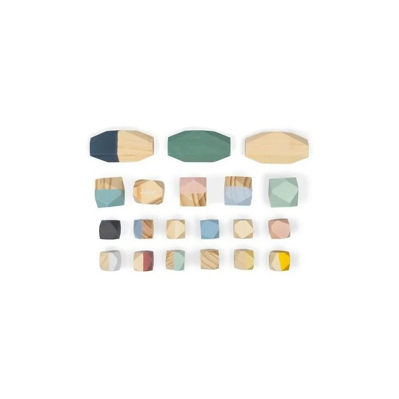Este juego consta de 20 piedras de madera con diferentes formas y cortes. También están disponibles en varios colores y se combinan perfectamente, gracias a su tono pastel extremadamente suave.