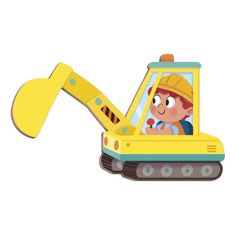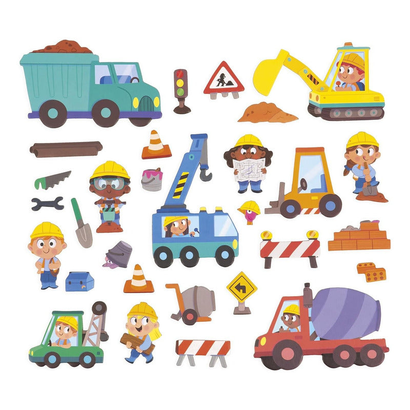 ¡La hormigonera por aquí! Marie, ¿tienes el martillo neumático? Este juego magnético con forma de obra de construcción será el punto de partida para las mejores historias de los niños a partir de 3 años.