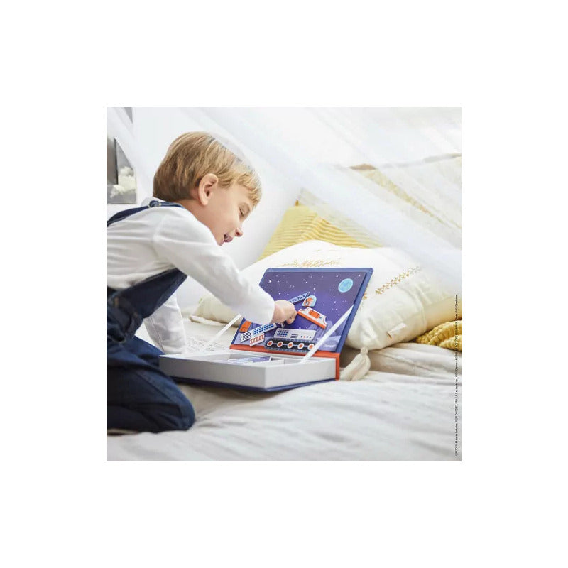 Este juego de cartón transportará a los niños a partir de 3 años al fascinante mundo del espacio y los planetas gracias a sus 52 imanes y 18 cartas. Dentro, una escena magnética sirve para recomponer el vehículo espacial que figura en la carta utilizando los imanes. El niño también puede divertirse mezclando las diferentes piezas entre sí para crear unas divertidas escenas, ya que son todas intercambiables.