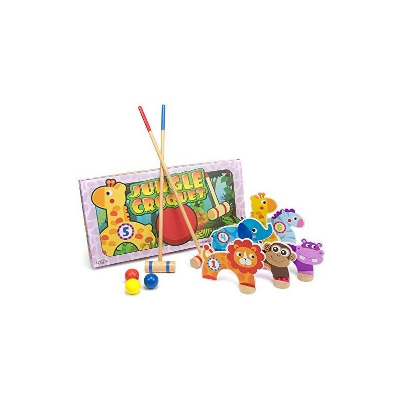 BRYBELLY. Set Juego Croquet De La Selva Para Niños Brybelly 100% Original Reúne la manada y agarra un mazo! Los más pequeños pasarán un rato salvaje con este juego de croquet de madera. ¡La mejor parte son personalizables! Coloca los wickets en una línea, o haz una forma. Colóquelos cerca o lejos. Una vez que esté listo, ¡use el mazo para golpear la bola debajo de cada animal hasta que llegue al final! Este set viene con todo lo necesario para enseñar a los más pequeños a jugar a este clásico juego. Es genial para que los niños jueguen solos o con un amigo. Ideales para que los más pequeños jueguen en interiores o en exteriores. El conjunto estaba hecho de textiles y cortes naturales de madera, luego ingeniosamente diseñado con pinturas seguras a base de agua. Edad Recomendada: +3 años Jugadores: 1-3 jugadores MEDIDAS Mazo: 54cm aprox. Pelota 4cm diámetro aprox. Figuras: 19cm de ancho x 16cm de alto aprox. INCLUYE: 2 mazos, 3 bolas y 6s wickets de animales de la jungla: león, mono, hipopótamo, elefante, jirafa y cebra. ------------------------------------------------------------ ------------------------------------------------------------