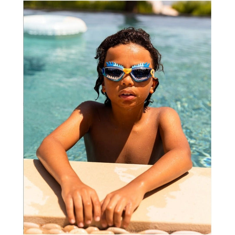 Sumérgete en el verano surcando las olas con estas gafas de natación estilo aviador, con feroces púas de silicona y una lente llena de colmillos serpentinos.