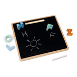 INCLUYE: 26 letras de madera, 1 pieza de tiza y un tablero de madera de doble cara.