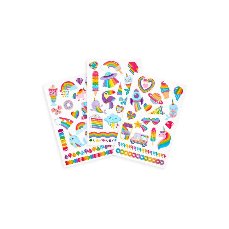 El set de tatuajes escarchados Over the Rainbow viene con 3 hojas de tatuajes temporales llenas de los diseños de arcoíris más coloridos. ¡Eso es más de 50 tatuajes en un conjunto! Este set de tatuajes está lleno de narvales con los colores del arco iris, unicornios, helados y mucho más.