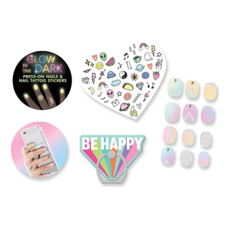 Todas las jóvenes a la moda apreciarán lo increíble que es este set. Incluye una lámina de tatuajes luminosos, un juego de 12 uñas postizas y un soporte para el teléfono.