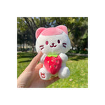 Gatito kawaii sosteniendo un peluche de fresa