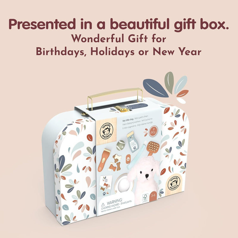 Los niños tendrán todo lo que necesitan en esta maleta bellamente diseñada para cuidar a su perro de peluche favorito (incluido). Cuenta con snacks para perros, tazón, cepillo, collar y algunos accesorios más.