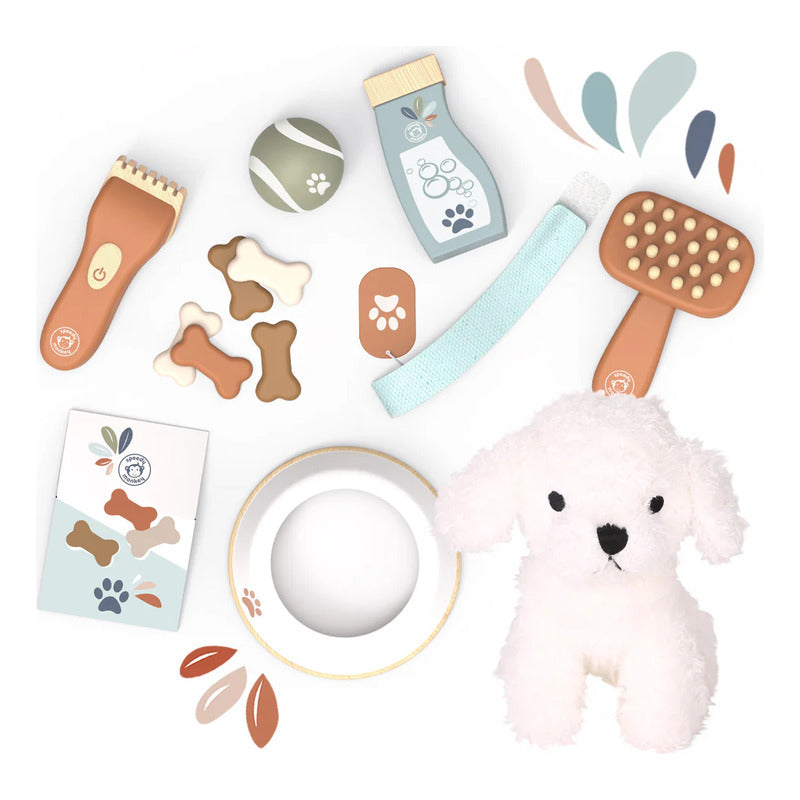 Maleta con accesorios de peluquería de madera y perro de peluche.