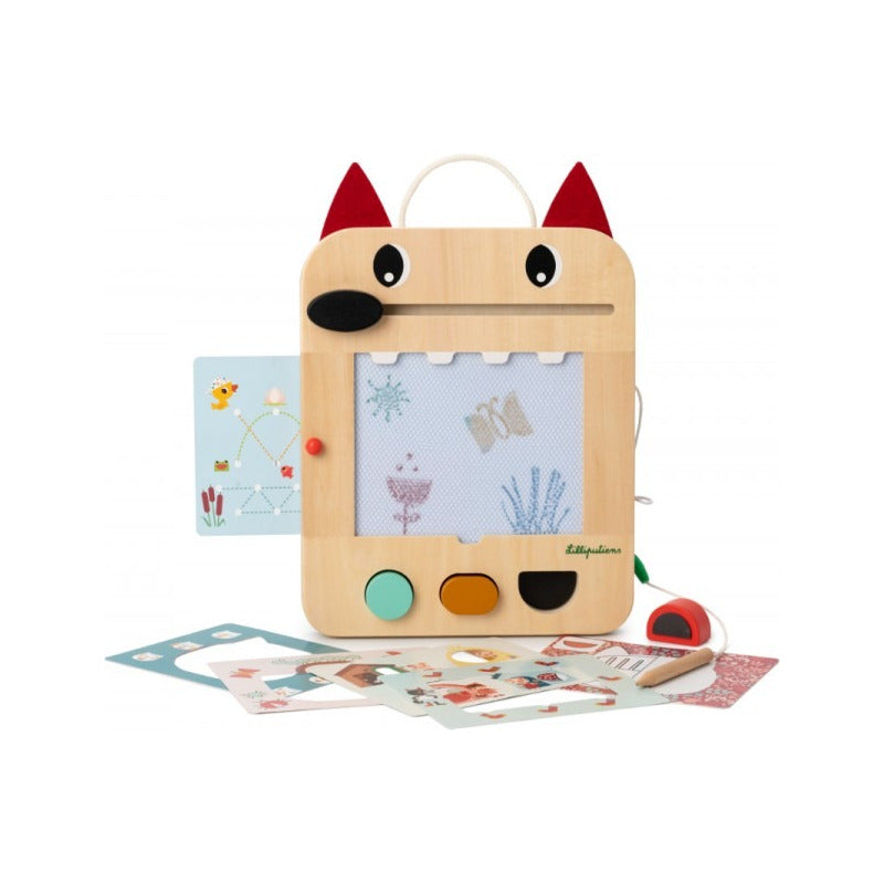 La pizarra mágica de Louis el lobo ofrece diversión infinita para dibujar y jugar. Con diferentes colores, 3 sellos con formas geométricas, 6 tarjetas con 12 juegos y un lápiz de madera, estimula las manitas y las mentes de los más pequeños.