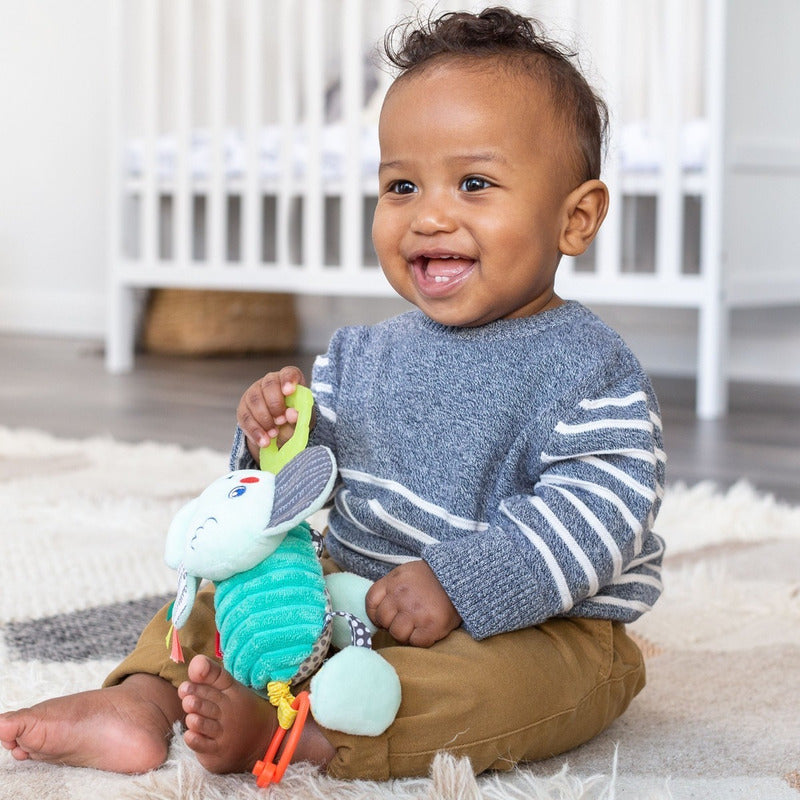 ¡Dale un tirón a este simpático elefante y mira cómo se mueve y baila! A las manos pequeñas y a las mentes curiosas les encantará explorar los lujosos materiales premium y los divertidos sonidos de Shake & Pull Jittery Pal. ¡Perfecto para el entretenimiento en movimiento!