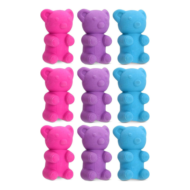 El juego de borrador de nueve piezas cuenta con amigos gomosos 3D en tres colores brillantes que seguro que te harán sonreír Inicia o termina tu próximo proyecto con estos osos amigos