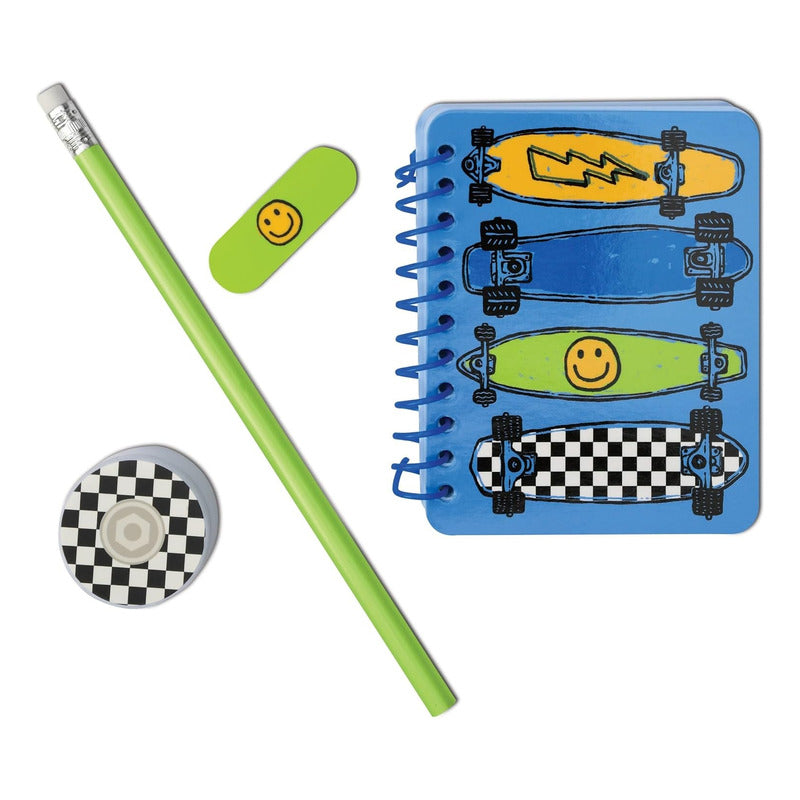 INCLUYE: lápiz colorido, sacapuntas, borrador de forma divertida, cubierta de diseño de patineta, mini cuaderno, portapapeles y bloc de notas colorido
