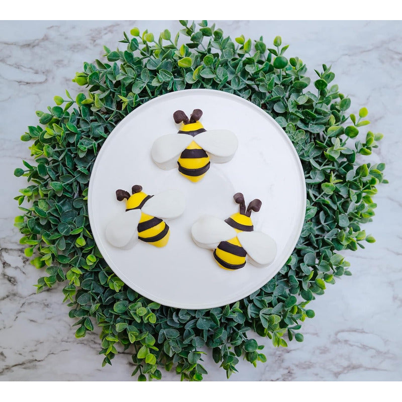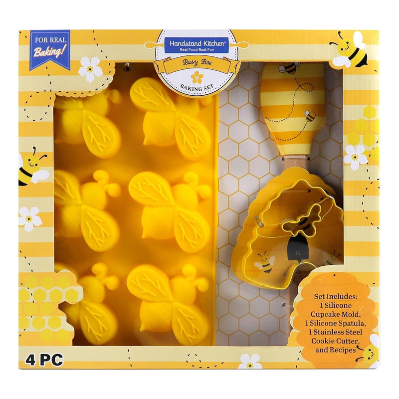 INCLUYE: 1 molde de silicona para cupcakes con 6 formas de abeja, 1 espátula de silicona, 1 cortador de galletas de acero inoxidable y recetas.