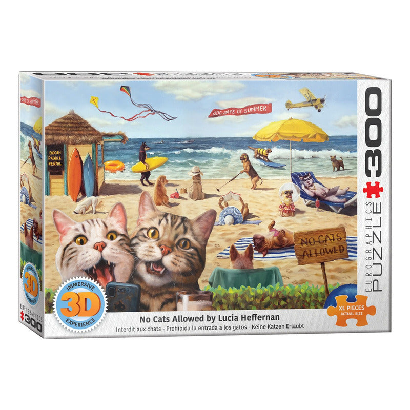 ¡Sumérgete en un divertido día de playa como ningún otro con el No se permiten gatos - Rompecabezas lenticular 3D (300 piezas) de Lucia Heffernan! Repleta de personalidad y humor, esta escena soleada está llena de cachorros amantes de la diversión que disfrutan de la playa, mientras dos gatos astutos intentan unirse a la fiesta.