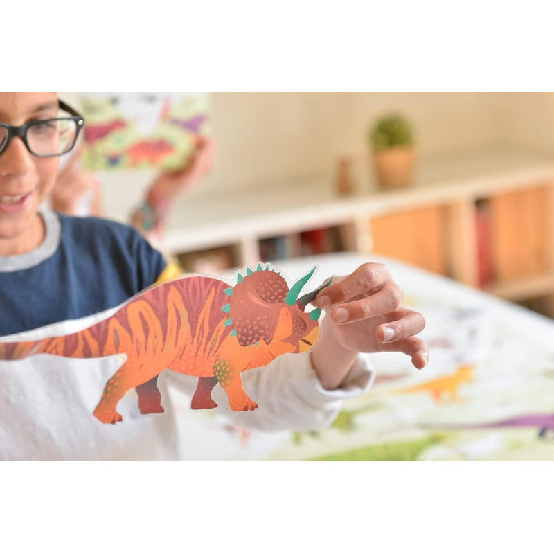 Con este póster, los niños se apasionan por los dinosaurios: pegan las pegatinas en el póster gigante, separando las especies según los tres periodos principales (Triásico, Jurásico y Cretácico). Crean un póster precioso para la habitación.