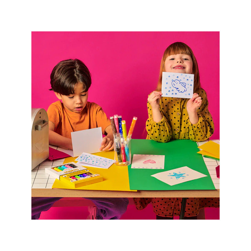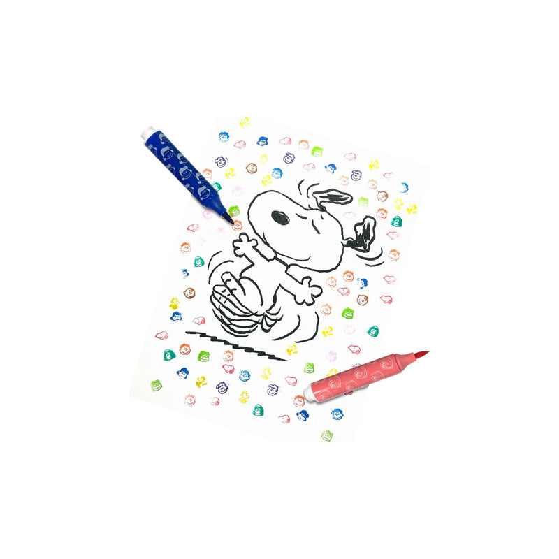 Cada marcador cuenta con una punta de pincel para colorear vibrantemente y una punta de sello para estampar las caras de tus personajes favoritos de Peanuts en papel.