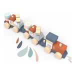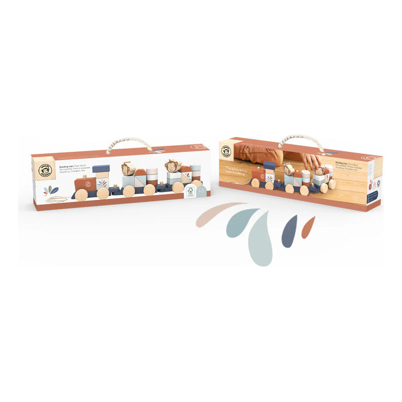 Un divertido apilador de trenes de madera, pintado en colores suaves de moda y con nuestro personaje favorito, el mono. Tu pequeño tendrá horas de diversión, apilando elementos en el tren y construyendo casas con bloques de colores.