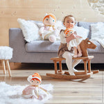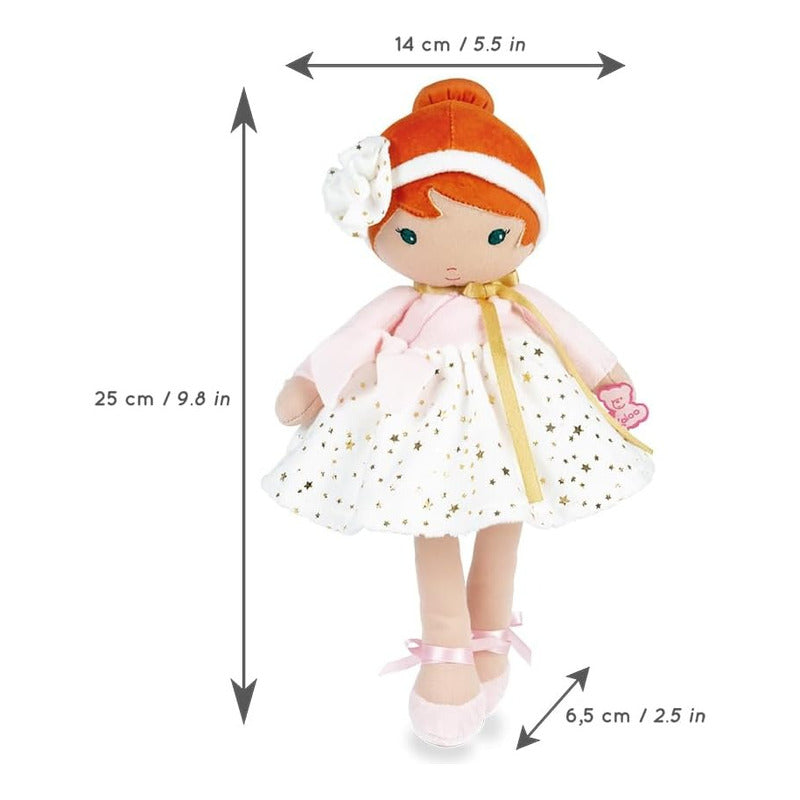 ¡Descubra la bailarina clásica que hará soñar a todas las pequeñas amantes del ballet! Vestida con un top cruzado de color rosa polvo resaltado con un fular dorado y una falda muy suave con un estampado de estrellas de color champán, Valentine muestra un estilo delicado y refinado. Su cabello pelirrojo la diferencia de las otras muñecas Tendresse.