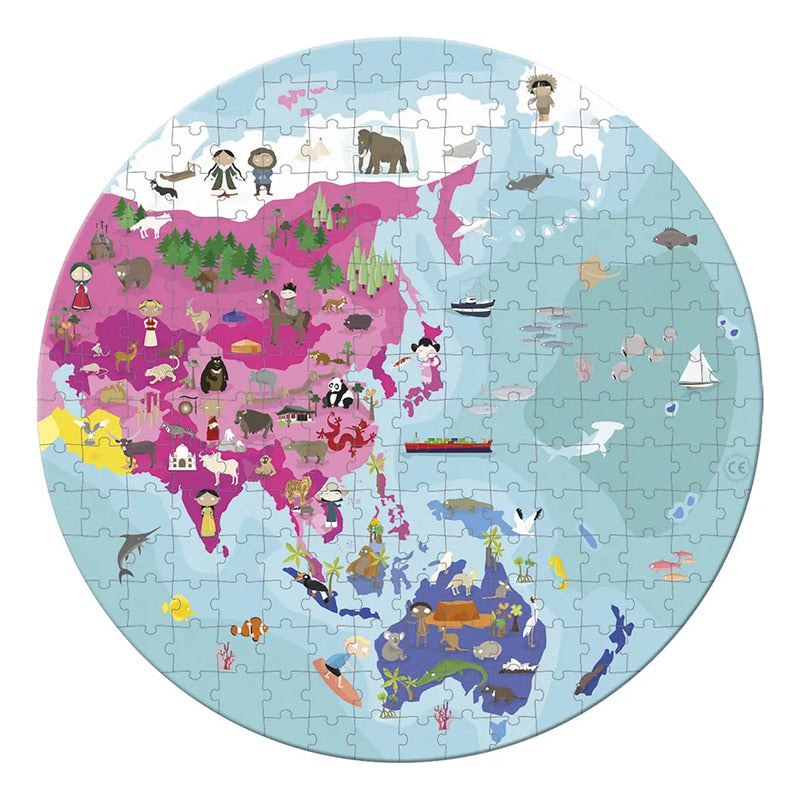 Puzzle con piezas de cartón ilustradas a dos caras sobre el tópico planeta Tierra. Ideal para aprender geografía y descubrir la cultura de los diferentes países. Ilustrado con las personas y los animales típicos de cada uno de los continentes.