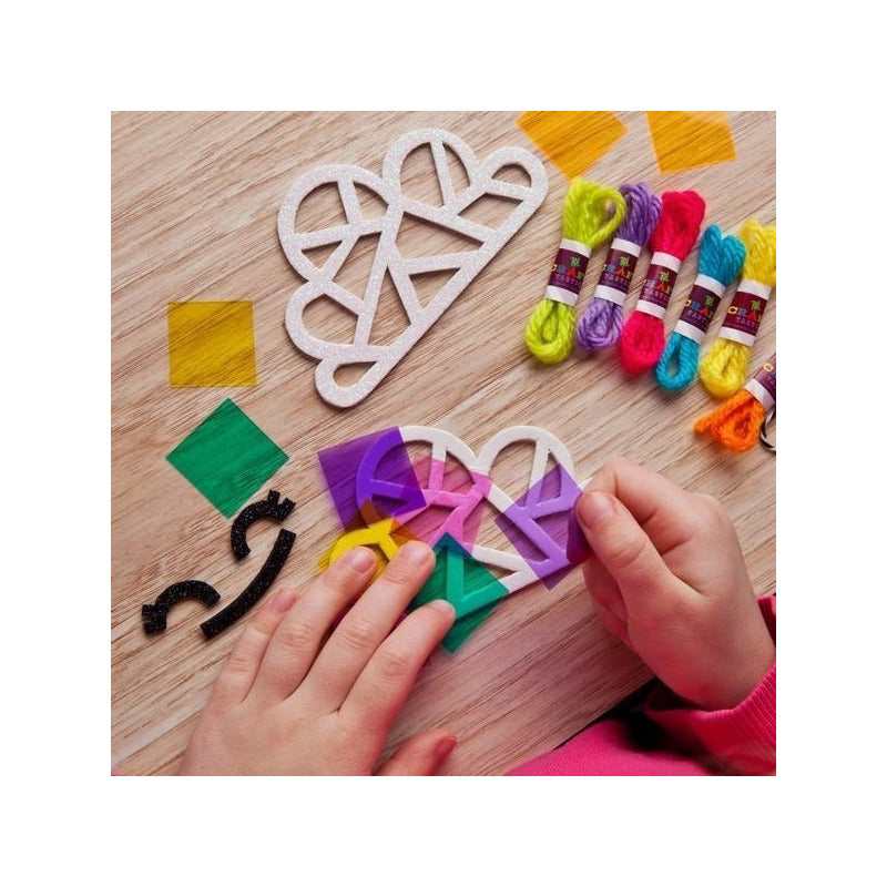 ¡Sólo tiene que organizar las piezas de colores entre dos hojas de espuma precortado para crear el efecto de vidriera, añadir el hilo y dejar que la diversión brillante en!