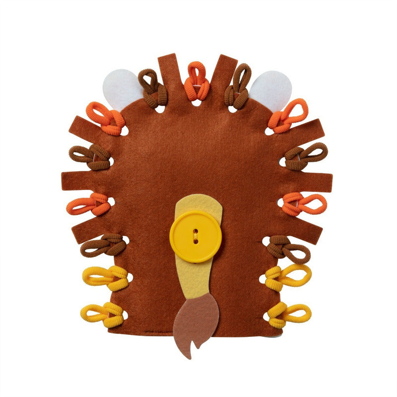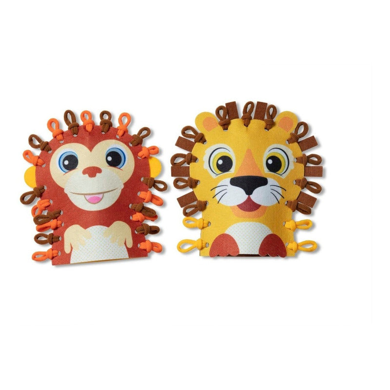 Incluye 4 paneles de fieltro para hacer dos títeres de safari (león y mono), 2 colas de fieltro para abotonar y 40 bucles elásticos.
