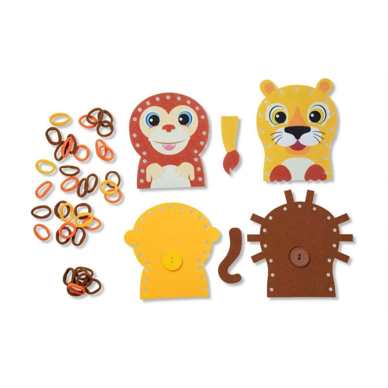 Kit de manualidades para principiantes de títeres de animales de safari en bucle; mete bucles elásticos a través de los agujeros para conectar los paneles de fieltro