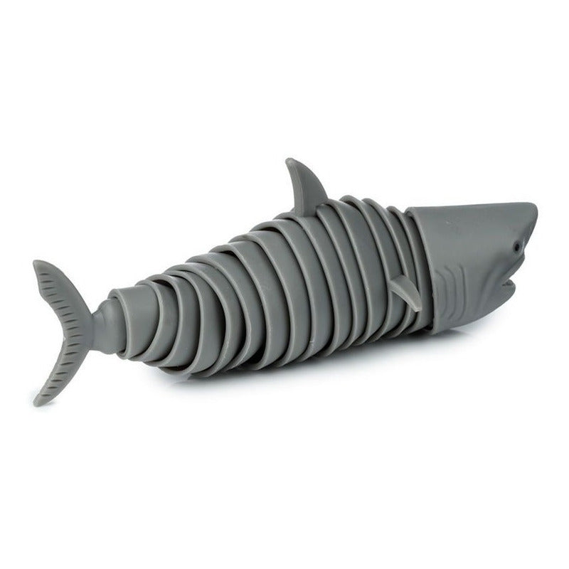 Con un cuerpo de secciones de cúpula articulada en tonos grises, aletas y una cara. Cuando doblas, sacudes o retuerces el cuerpo del tiburón, se escuchan pequeños chasquidos divertidos.