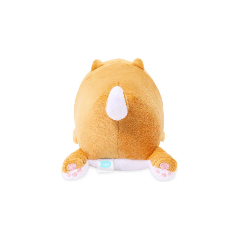 Bunniroll tiene un pelaje suave y corto como el de un cachorro de verdad, con cejas de Shiba bordadas, patas rosas y una cola juguetona.