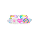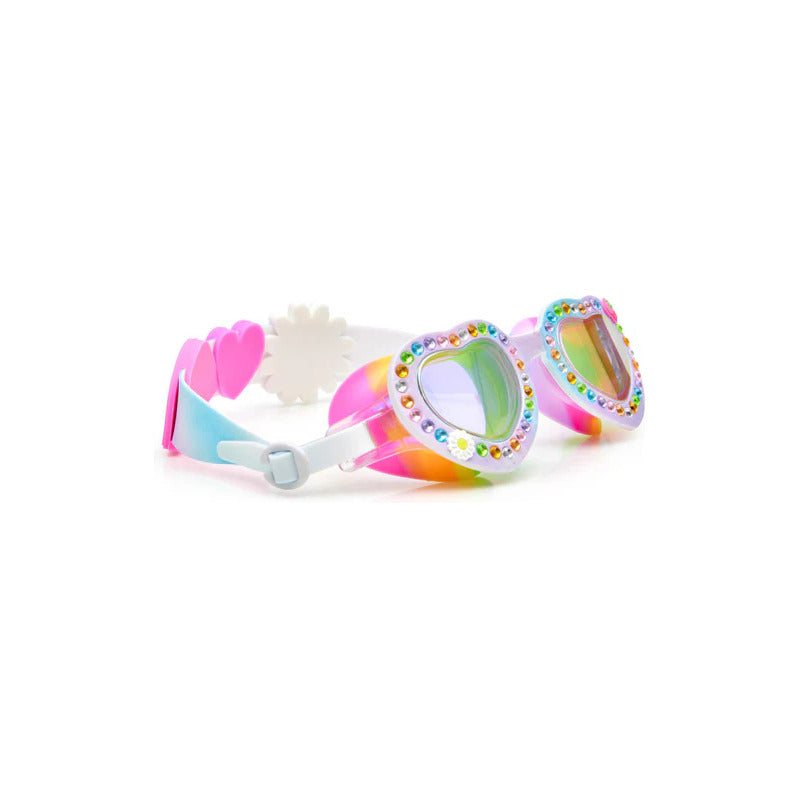 Estas gafas de natación tienen una novedosa forma de corazón con brillantes de colores y divertidas calcomanías con un deslizador de silicona con margaritas, arcoíris y corazones.