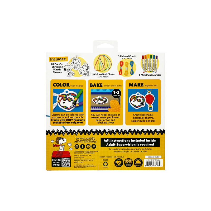 ¡Crea tu propio kit para crear dijes de Snoopy! El kit de arte termo-encogible OOLY x Peanuts te permite crear 20 coloridos dijes de Snoopy que se encogen al tamaño de un accesorio al hornearlos.