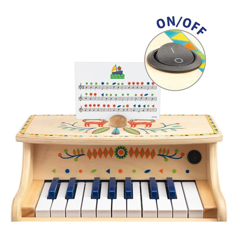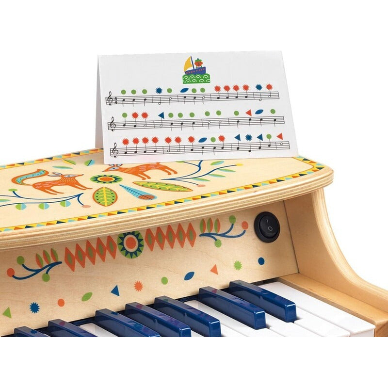Un maravilloso piano electrónico de madera diseñado para niños con hermosas ilustraciones. Los niños pueden utilizar las partituras para tocar cuatro canciones populares o componer sus propias piezas.