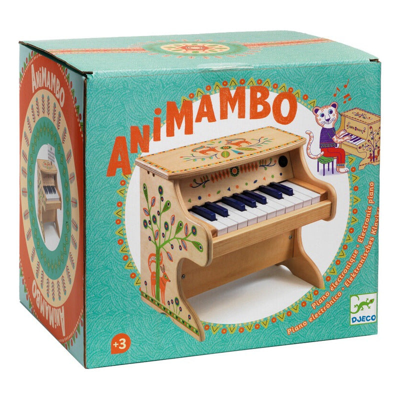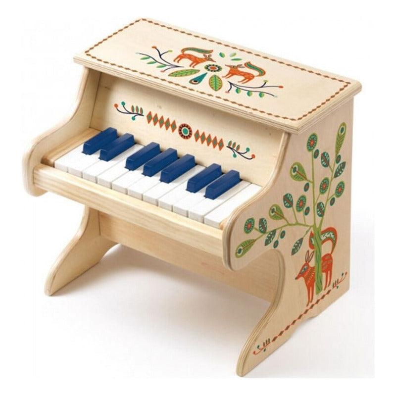 Contenido: 1 piano electrónico (madera), 1 soporte pequeño (madera), teclado de plástico y 1 partitura (tarjeta).