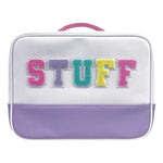 Olvídate de esos neceseres estándar con su aspecto sobrio y telas básicas: ¿qué gracia tiene? En su lugar, apuesta por lo original con este divertido y colorido neceser con asa, ¡nada aburrido!, que presenta llamativas letras de chenilla que forman la palabra "Stuff".