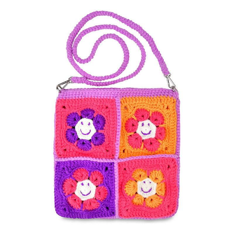 Olvídate de esos bolsos comunes con su apariencia sobria o sus gráficos poco imaginativos: ¿qué gracia tienen? ¡Dale un toque de color y humor con este bolso bandolera divertido y colorido, todo menos aburrido! Este encantador bolso de crochet presenta cuatro alegres caras sonrientes que alegrarán el día de todos. El bolso está completamente forrado y tiene un cierre de cremallera para mantener todo fácilmente accesible y totalmente seguro. La correa de hombro de crochet a juego también es extraíble.