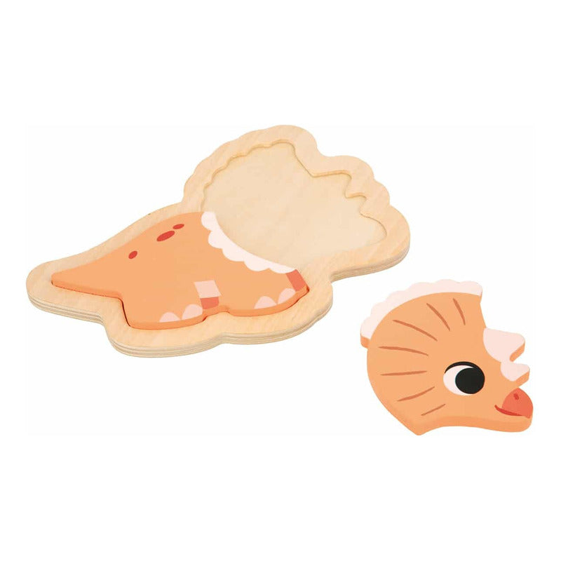 Este juego de rompecabezas progresivos de madera de la colección Dinosaurios de la marca francesa JANOD consta de 4 rompecabezas de diferentes niveles de dificultad.