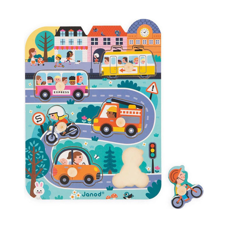 El rompecabezas de madera "En la Ciudad" de la marca francesa JANOD es un excelente primer rompecabezas para niños pequeños.