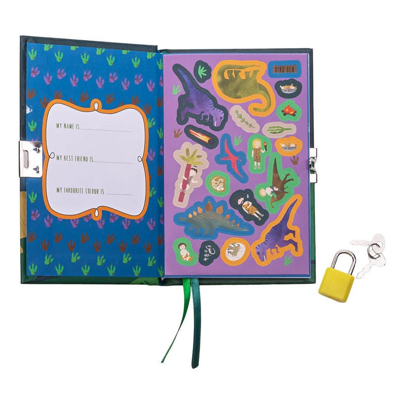 Incluye un candado y una llave Y una divertida hoja de pegatinas con dinosaurios, gente de las cavernas y mucho más.